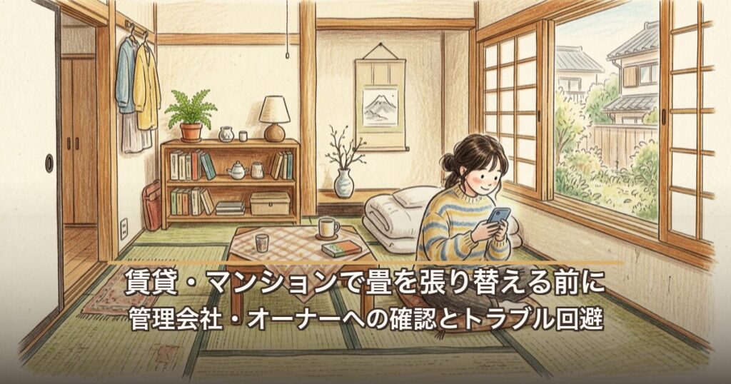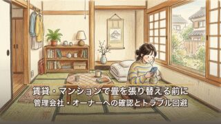 賃貸・マンションで畳を張り替える前に、管理会社やオーナーへ確認したいことを整理。許可・届け出、原状回復の考え方、費用負担、搬入条件まで。勝手に工事に入らずトラブルを防ぐ流れと、業者へ伝えるポイントをやさしく解説します。