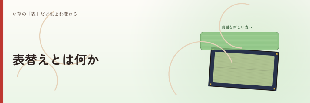 | 表替え | 表面の痛み/シミ/色あせ/畳床はまだ使える | コスパ◎ 短期間リニューアルに最適 |